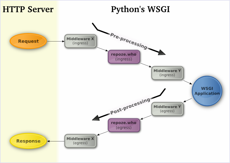 from webob import Request class MyMiddleware(object): def __init__(self, app, *args, **kwargs): self.app = app # other initialization # ... def __call__(self, environ, start_response): reqeust = Request(environ) # do stuff response = request.get_response(self.app) return response(environ, start_response)