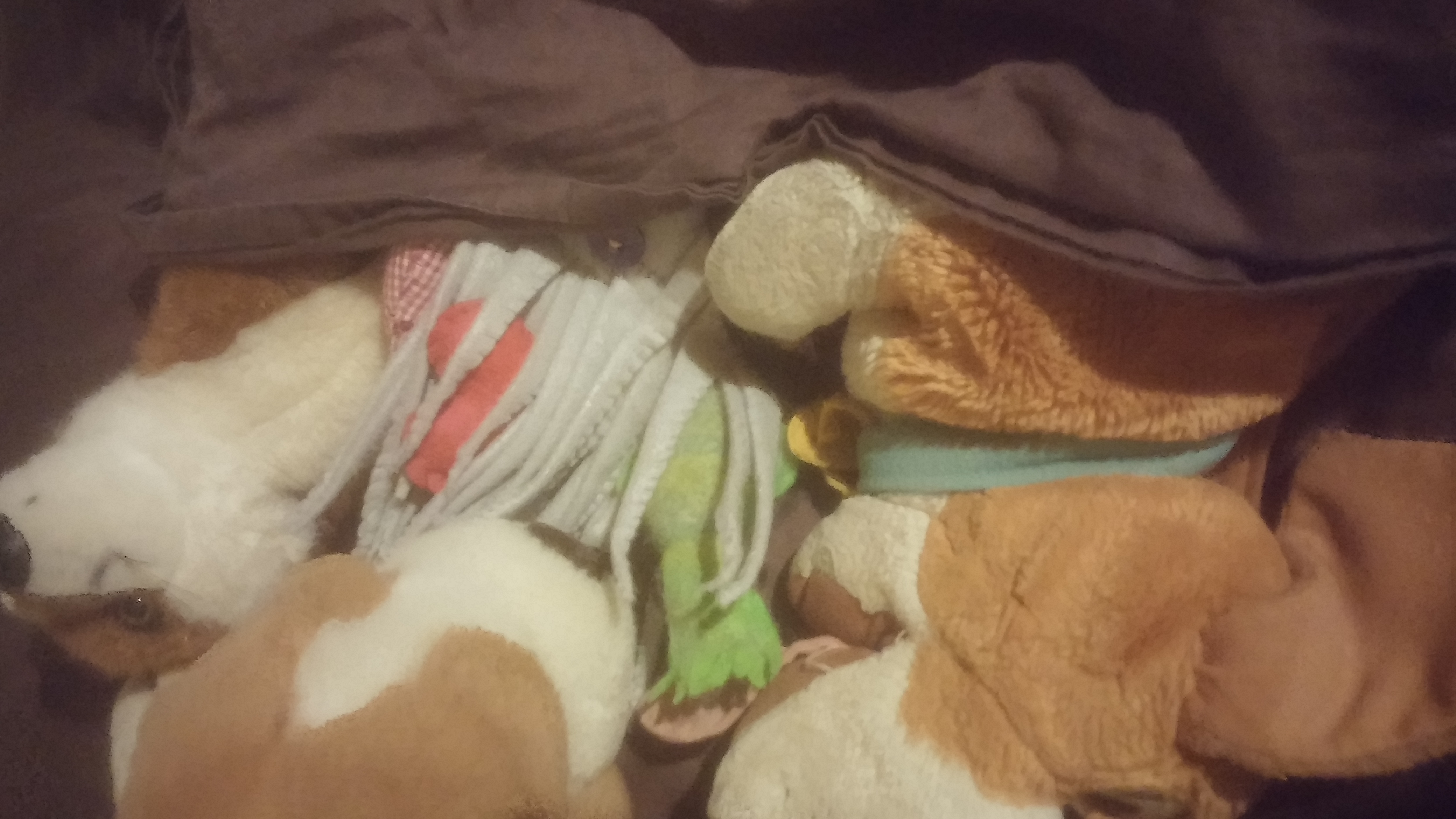 Poor nautilus was all worn out from the party. She is sleeping cuddled with a cuttlefish, a fox, and some bassetts still holding her cute red heart. I think she likes to cuddle.